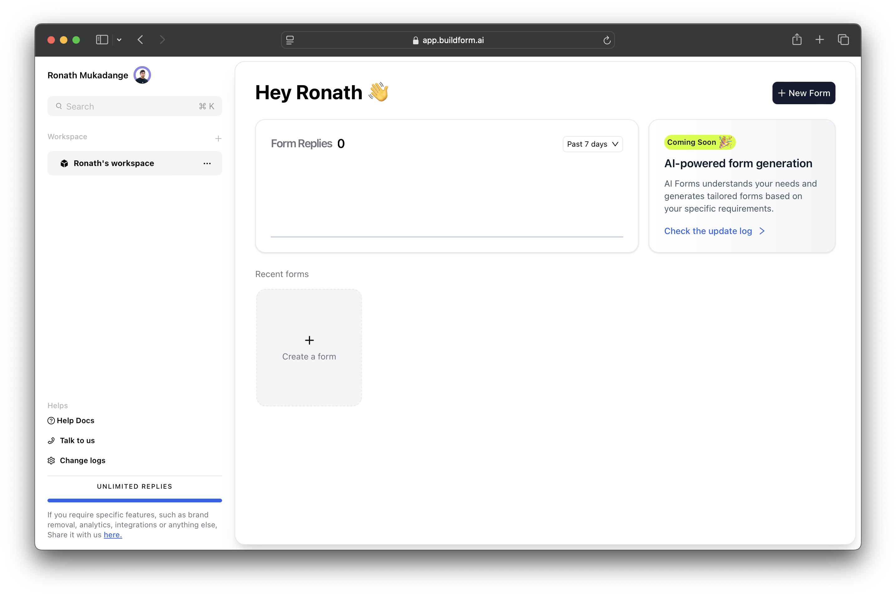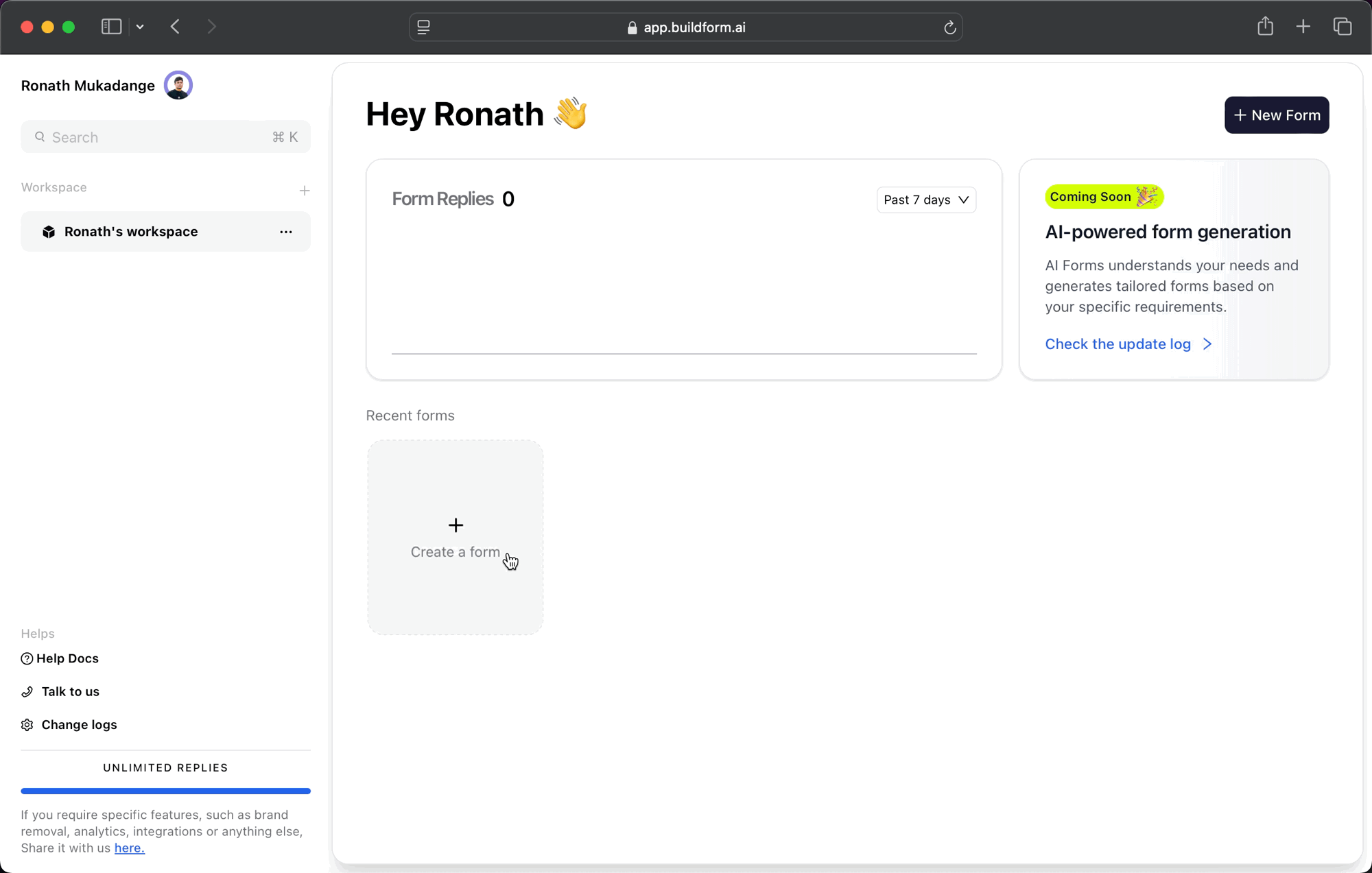 Once you've completed the sign-up process, you'll be taken to your default workspace. To start building, simply click on the Create Form or New Form button and begin designing your form.