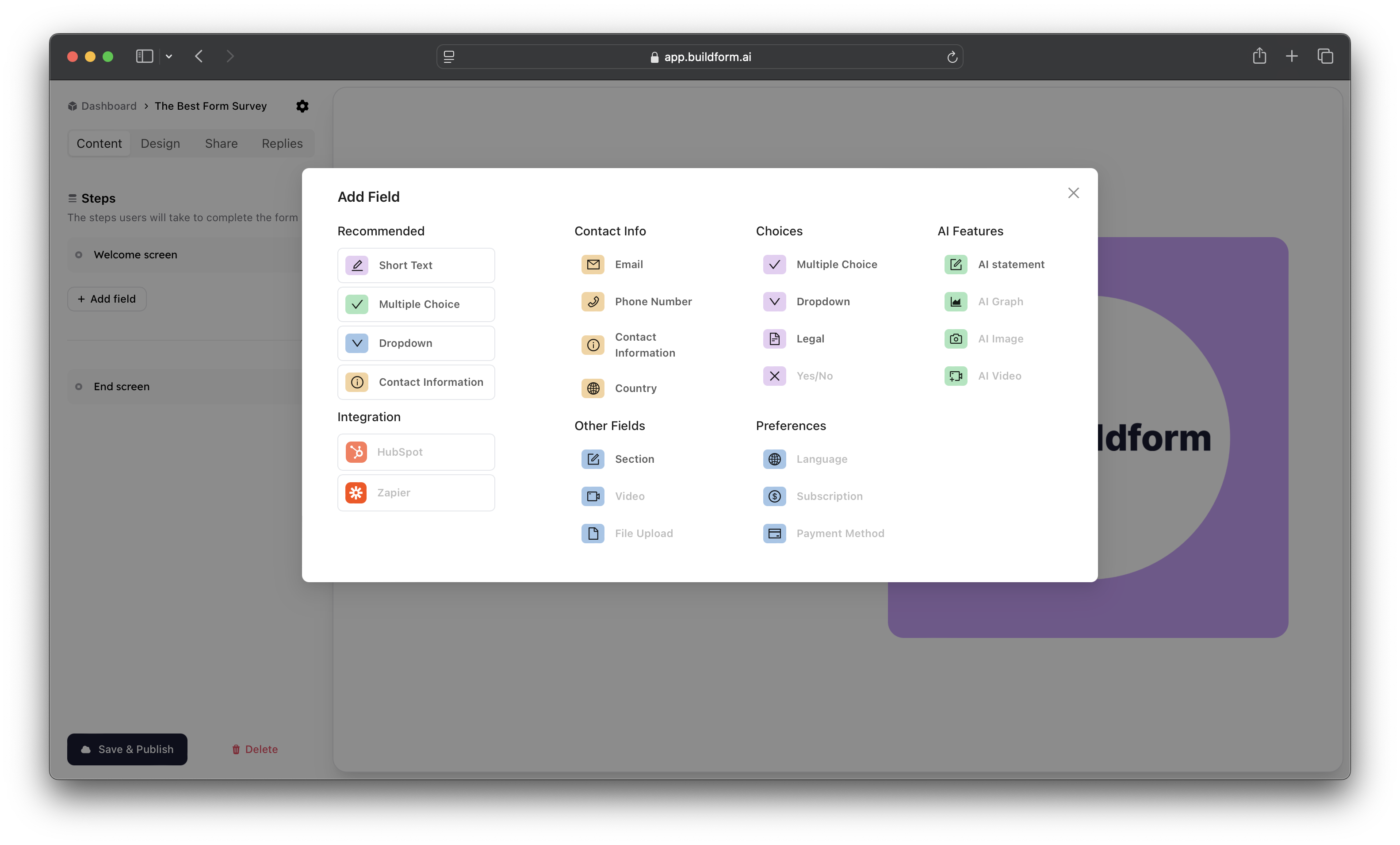 To select your form fields, simply click the Add Field button on the left side of the panel. This will open a popup with a variety of field options to choose from, allowing you to customise your form based on your specific needs.